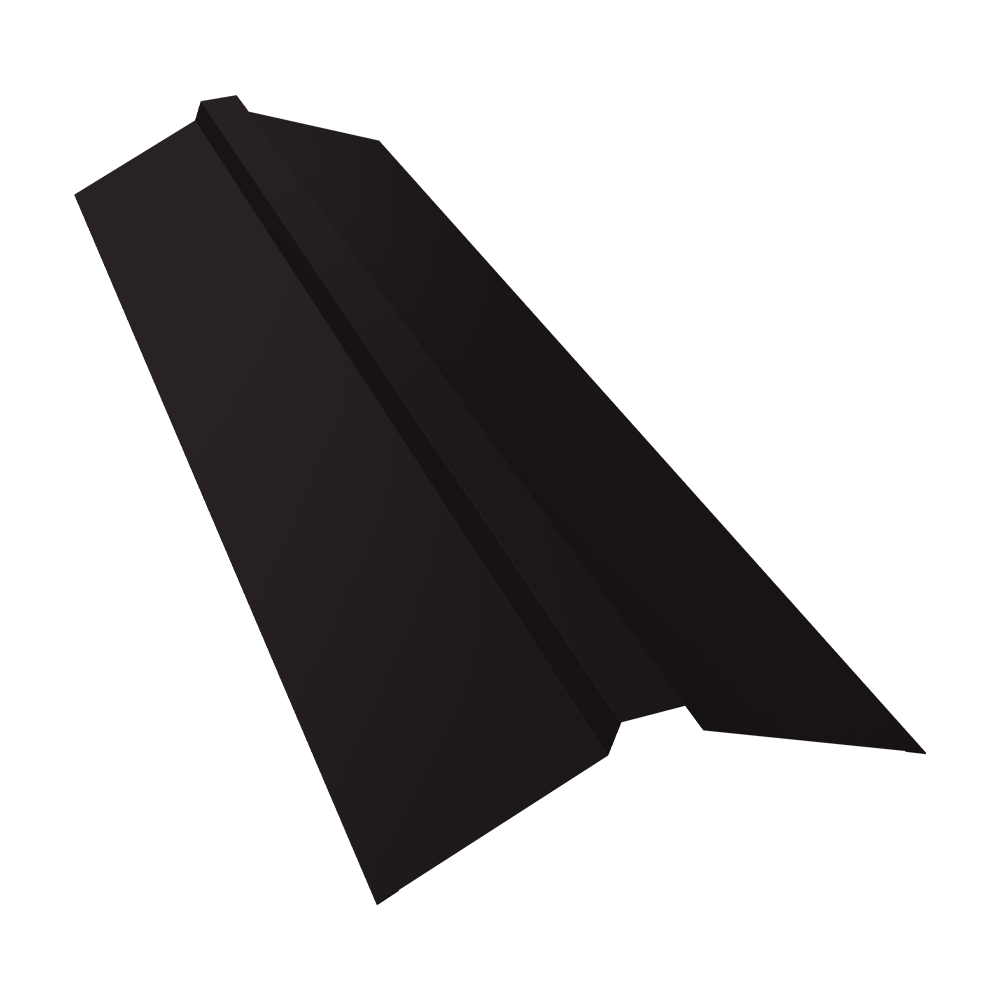 Планка конька прямоугольного предназначена для защиты от попадания влаги, грязи в подкровельное пространство и от срыва листов порывами ветра, закрывая листы металлочерепицы или профнастила на коньке и наружных переломах кровли.
